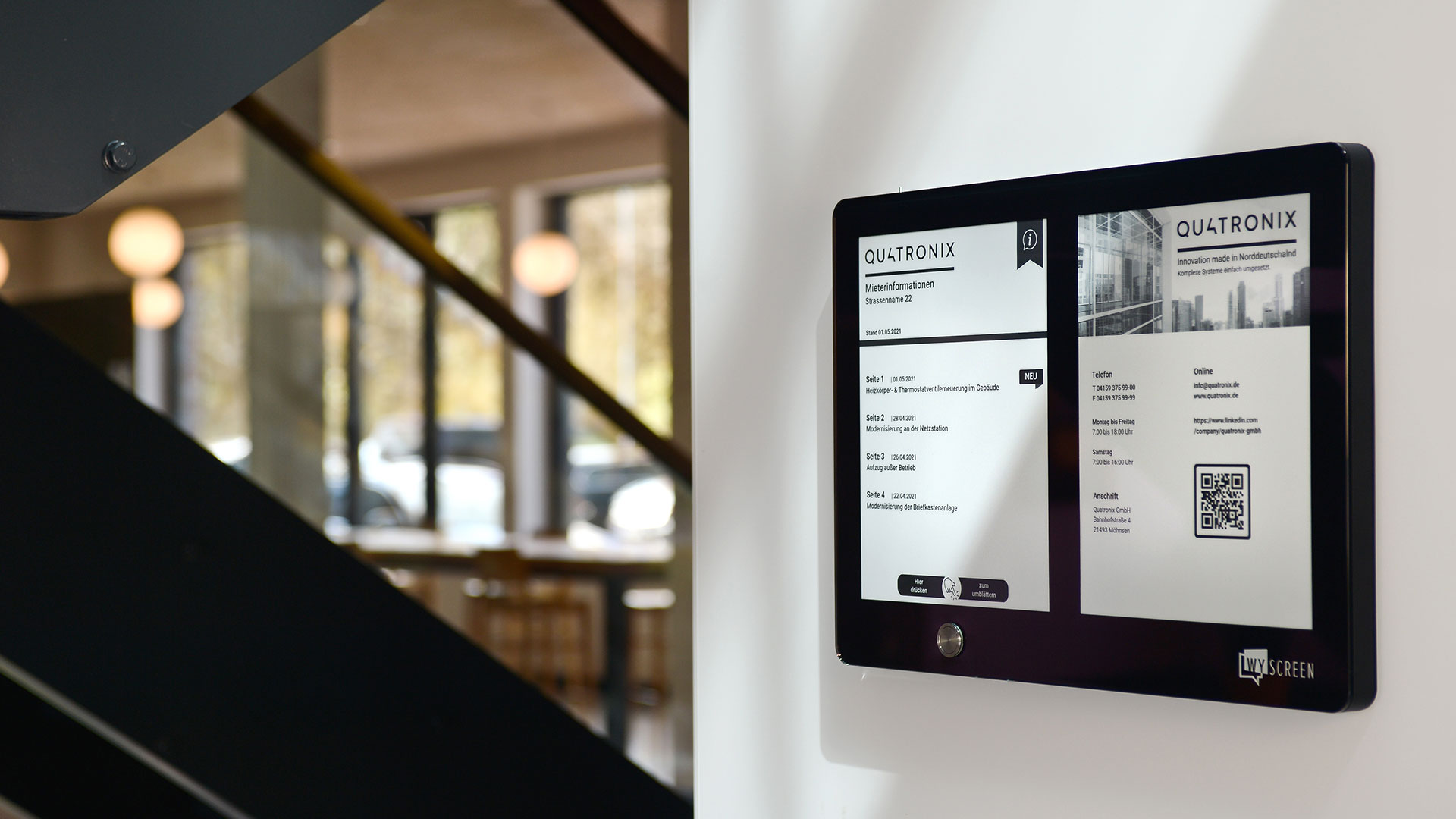 Die digitale Aushanglösung für Bereiche, in denen Informationen noch in Papierform verbreitet werden. Dank autonomem Akkubetrieb funktioniert sie bis zu einem Jahr autark.